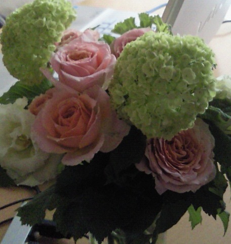 色つきの華は、白にほんのり淡いピンク、暗い赤褐色や紫しかなくて、1000円でアレンジ頼んだら、てんこもりの緑の中に大手鞠(小手毬かも?)と、地味色ピンクのカーネーションと薔薇をあわせてくれた。